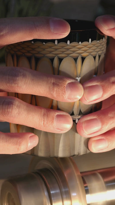 GEKKO captures the serene yet powerful brilliance of moonlight against the midnight sky through rhythmic cuts. The striking contrast of light and shadow creates an intricate, highly detailed design, meticulously hand-cut by master artisans. When liquid is poured, the patterns carved into the base reflect onto the sides, forming a mesmerizing kaleidoscope of light.